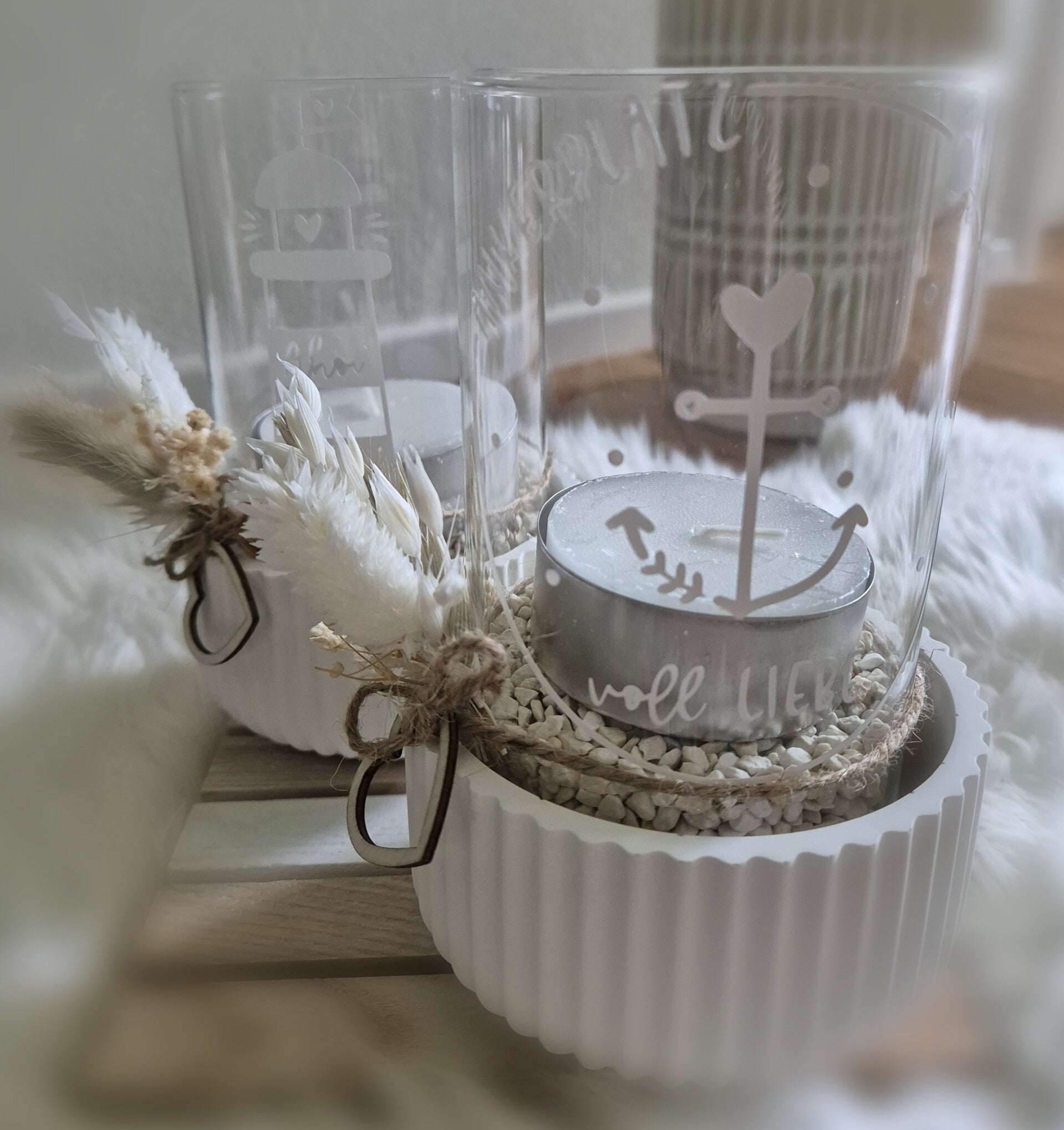 Das Raysintöpfchen hat ca. einen Durchmesser von 10cm. Die Höhe vom Windlichtglas ist bei ca. 15cm.
