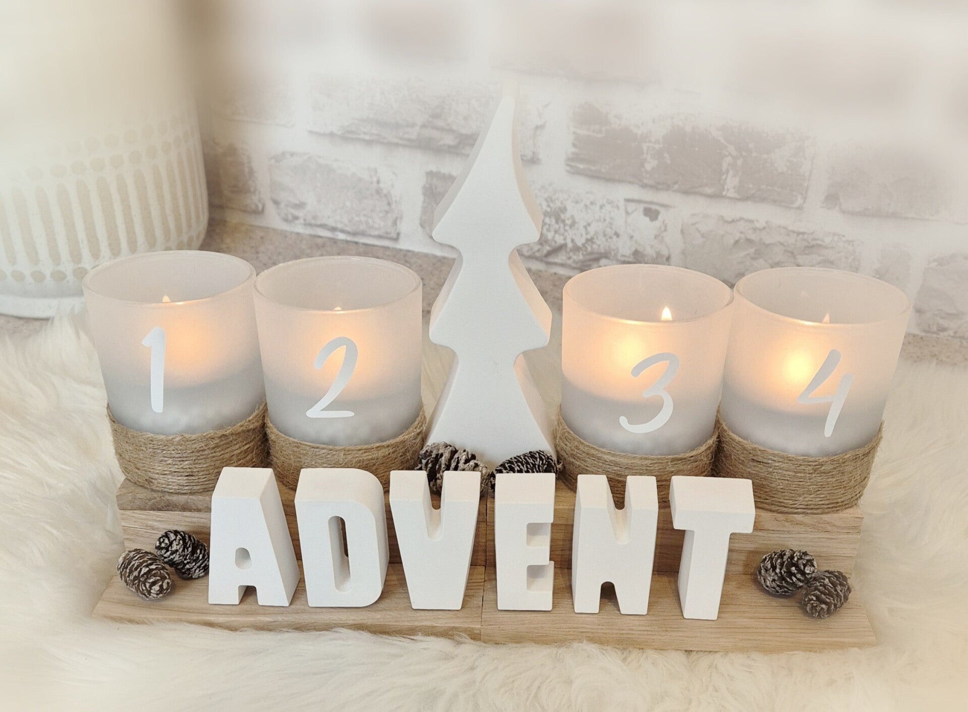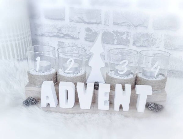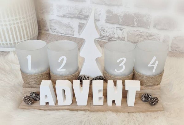 - Minimalistisches Design: Die schlichte Form und der klare Schriftzug "ADVENT" und die Gläser mit den Zahlen 1-4, sowie der Jutenschnur fügen sich perfekt in jeden Einrichtungsstil ein – von modern bis rustikal.