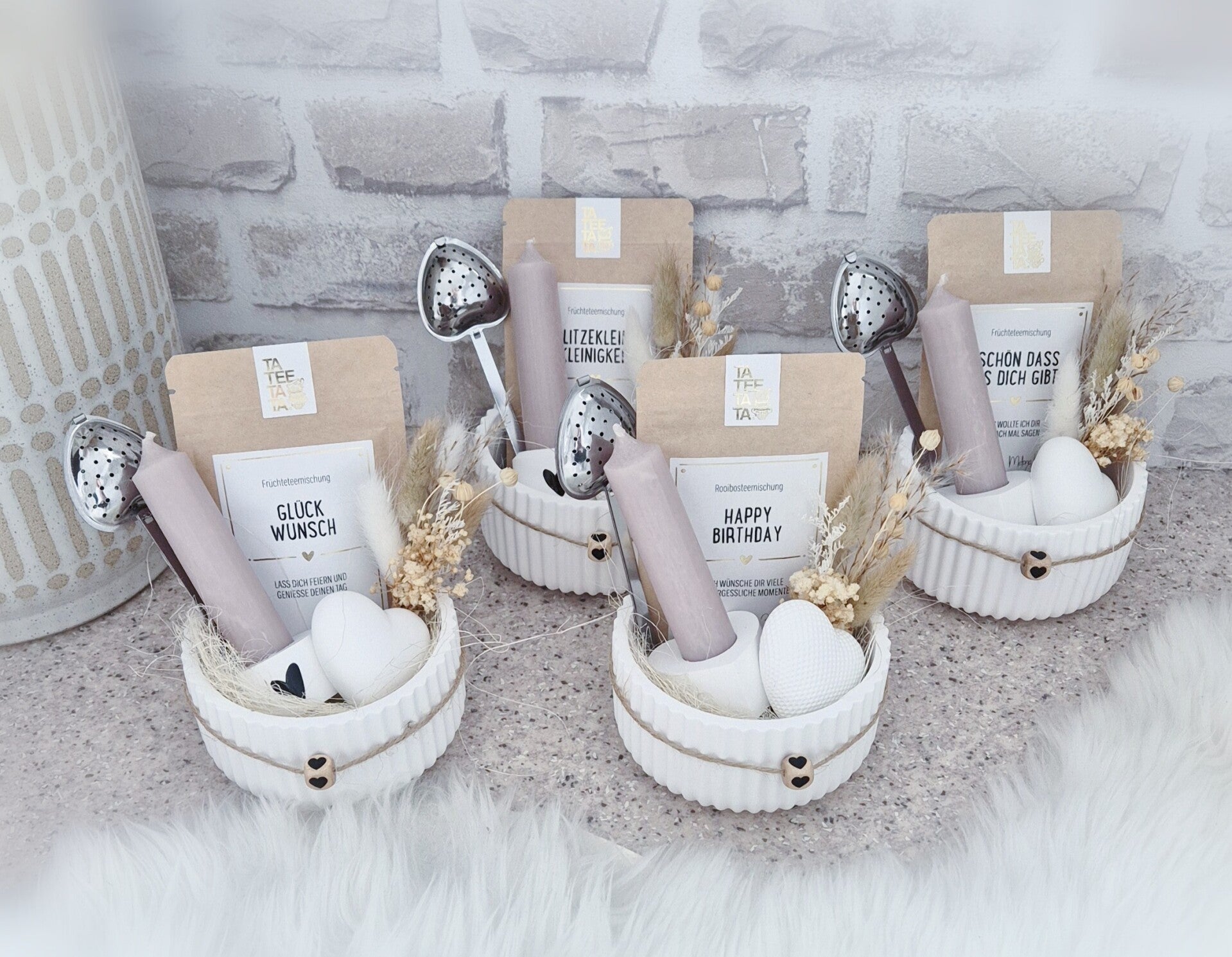 Dieses Set besteht aus einem Töpfchen, mit dem Durchmesser von ca. 10cm, einer Teemischung (div. Schriftzüge stehen zur Auswahl), einen Teesieblöffel in Herzform, einer Kerze im Kerzenhalter, einem Trockenblumensträusschen und einem Herz, welches als Deko oder z.B als Briefhalter genutzt werden kann.